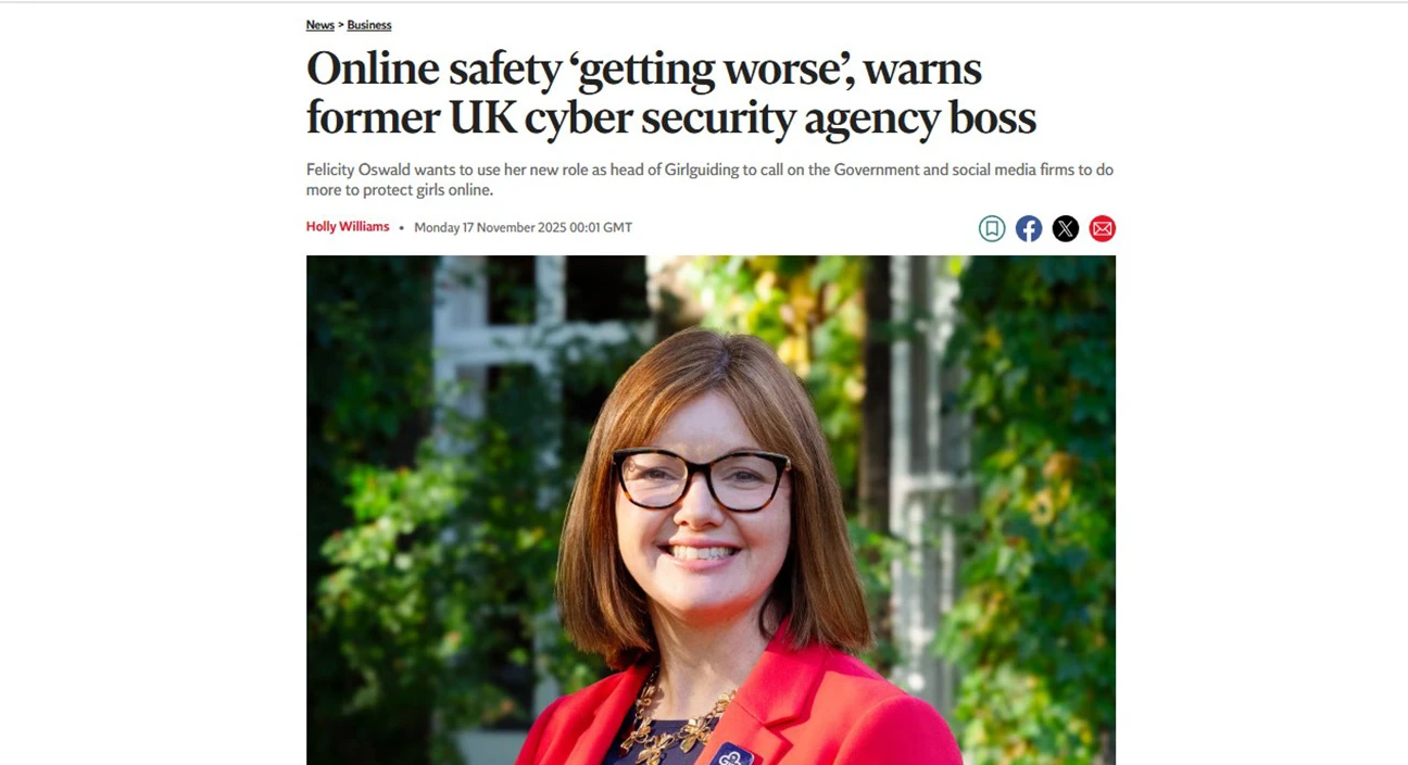 ইত্তেহাদ নিউজ,অনলাইন : যুক্তরাজ্যের সাইবার নিরাপত্তা সংস্থার সাবেক প্রধান ও গার্লগাইডিং-এর নতুন চিফ এক্সিকিউটিভ ফেলিসিটি ওসওয়াল্ড অনলাইন নিরাপত্তার বিষয়ে সতর্ক করেছেন। তিনি জানিয়েছেন বর্তমান সময়ে অনলাইন নিরাপত্তা আগের চেয়ে আরও খারাপের দিকে যাচ্ছে। তিনি বলেন, সোশ্যাল মিডিয়া প্ল্যাটফর্মগুলো মেয়েদের নিরাপদ রাখতে যথেষ্ট কাজ করছে না, বরং অনেকে অনলাইন সেফটির জন্য বাজেট কমিয়ে দিচ্ছে।
