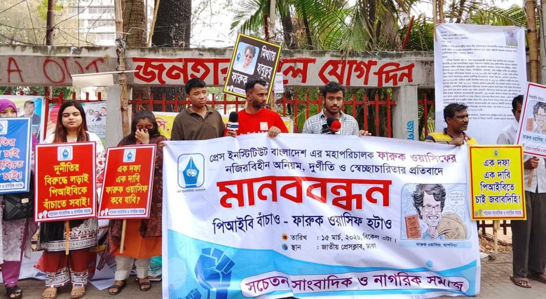 পিআইবির মহাপরিচালককে অপসারণের দাবি ,জাতীয় প্রেস ক্লাবের সামনে সচেতন সাংবাদিক ও নাগরিক সমাজের ব্যানারে মানববন্ধন ঢাকা: অনিয়ম, দুর্নীতি ও স্বেচ্ছাচারিতার অভিযোগে প্রেস ইনস্টিটিউট বাংলাদেশের (পিআইবি) মহাপরিচালক ফারুক ওয়াসিফকে ২৪ ঘণ্টার মধ্যে অপসারণের দাবিতে মানববন্ধন অনুষ্ঠিত হয়েছে। রোববার (১৫ মার্চ) বিকেলে জাতীয় প্রেস ক্লাবের সামনে সচেতন সাংবাদিক ও নাগরিক সমাজের ব্যানারে এই মানববন্ধন অনুষ্ঠিত হয়। মানববন্ধনে ‘পিবিআই বাঁচাও, ফারুক ওয়াসিফ হটাও’, ‘এক দফা এক দাবি, ফারুক ওয়াসিফ কবে যাবি?’, ‘ইয়ে করে দেখায়ে দিয়ে টাকাটাও ইয়ে করে দিও’, ‘মিথ্যায় হাবুডুবু ফারুক ওয়াসিফ’ ইত্যাদি প্লাকার্ড দেখা গেছে। আরও পড়ুন: পিআইবিতে অবসরপ্রাপ্তদের হয়রানির অভিযোগ: ডিজি ফারুক ওয়াসিফ'র অপসারন দাবী পিআইবি মহাপরিচালক ফারুক ওয়াসিফের লুটপাট , দুই দিনে ২৪ লাখ টাকার অনিয়ম পিআইবিতে ভুয়া সেমিনারের নামে লাখো টাকা আত্মসাৎ, অনুসন্ধানে বেরিয়ে এলো চাঞ্চল্যকর তথ্য ফারুক ওয়াসিফ, পিআইবি ও স্বচ্ছতার প্রশ্ন প্রতিষ্ঠান কিংবা ব্যক্তি: নিরপেক্ষ তদন্তে সত্য উদঘাটন জরুরি মানববন্ধনে উপস্থিত বক্তারা বলেন, অত্যন্ত দুঃখের বিষয় আসিফ মাহমুদ সজীব ভূঁইয়া এবং আসিফ নজরুল পক্ষপাতিত্ব করে অযোগ্য লোকদেরকে চুক্তিভিত্তিক নিয়োগ দিয়েছে। যে প্রতিষ্ঠানগুলোতে ছিলেন সেই প্রত্যেকটা প্রতিষ্ঠানগুলো দুর্নীতিগ্রস্ত হয়ে গেছে। বিজ্ঞাপন তারা বলেন, আসিফ মাহমুদ সজীব ভূঁইয়ার পিএস ৪০০ কোটি টাকার মালিক হয়েছে। পিএস যদি ৪০০ কোটি টাকার মালিক হয় তাহলে উনি কত কোটি টাকার মালিক হয়েছে এটা আপনারা চিন্তা করেন। কারণ সে যদি দুর্নীতিগ্রস্ত না হয় তার পিএস দুর্নীতিগ্রস্ত হতে পারে না। সে কোনো ব্যবস্থা গ্রহণ করে নাই। আপনারা দেখেছেন যে ইতিমধ্যে এই সজীবের সম্পদের হিসাব চাচ্ছে দুদক। চুক্তিভিত্তিক নিয়োগগুলো তারা কিভাবে দিয়েছে এটা তদন্ত করতে হবে। তারা টাকা খেয়ে দিয়েছে না তারা পক্ষপাতিত্ব আত্মীয়স্বজনকে দিয়েছে এইটাও তদন্ত করে বের করে নিয়ে আসতে হবে। মানববন্ধন থেকে তথ্যমন্ত্রীর কাছে আহ্বান জানিয়ে বলা হয়, তথ্যমন্ত্রীর কাছে আহ্বান যত তাড়াতাড়ি সম্ভব এই ফারুক সাহেবকে সরিয়ে এখানে একটা যোগ্য অভিজ্ঞ একটা মহাপরিচালক দিবেন। কারণ এটা একটা শিক্ষাপ্রতিষ্ঠানের মতো। এখানে সাংবাদিকদের আস্থা। সেখানে সাংবাদিকদের বিভিন্ন গবেষণা হয়। সেই প্রতিষ্ঠানকে ধ্বংস করে দিচ্ছে অযোগ্য অপদার্থ এবং স্বজনীতি প্রাপ্ত কিছু লোকজনের মাধ্যমে।