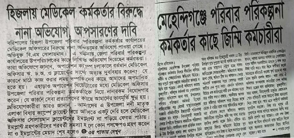 অনৈতিক প্রস্তাব ও ছয় মাস বেতন বন্ধ থাকা পরিবার কল্যাণ পরিদর্শিকা উম্মে হাবিবা ছন্দা অভিযোগ করেছেন, ডা. এবিএম সোলায়মান মাসুমের অনৈতিক প্রস্তাবে রাজি না হওয়ায় তাকে প্রশাসনিকভাবে ‘টার্গেট’ করা হয়েছে।